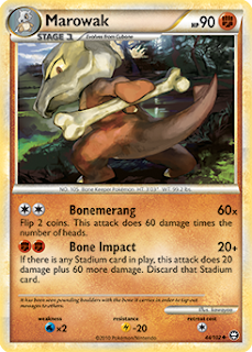 Bonemerang is Marowak most powerful move when there is no Stadium card in play. It does 60 damage, times the number of heads you get. So, if you’re lucky and you get two heads, the move does 120 damage.