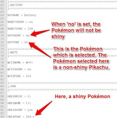 To change the default Pokémon shown, simply change the ‘Poke’ (located at the bottom of each section) to the Pokédex number of the Pokémon you want. If you want the Pokémon to be shiny, simply change the ‘Shiny’ (located above the ‘Poke’) to yes.